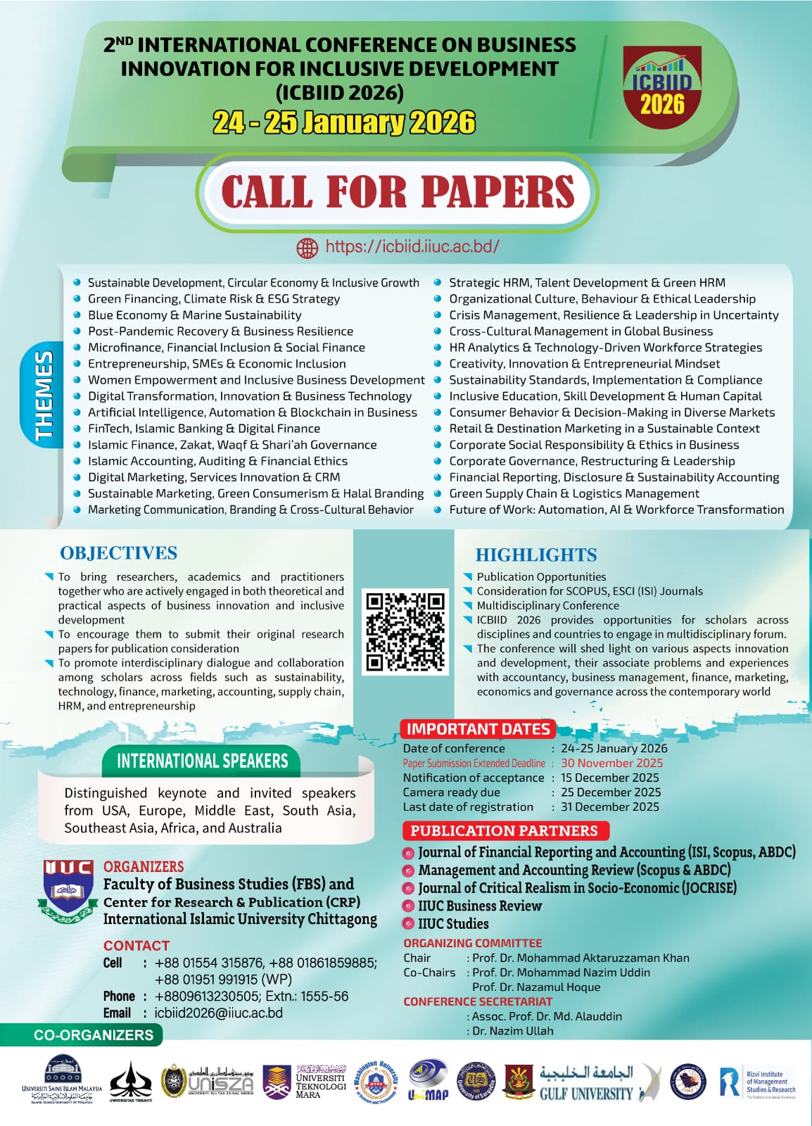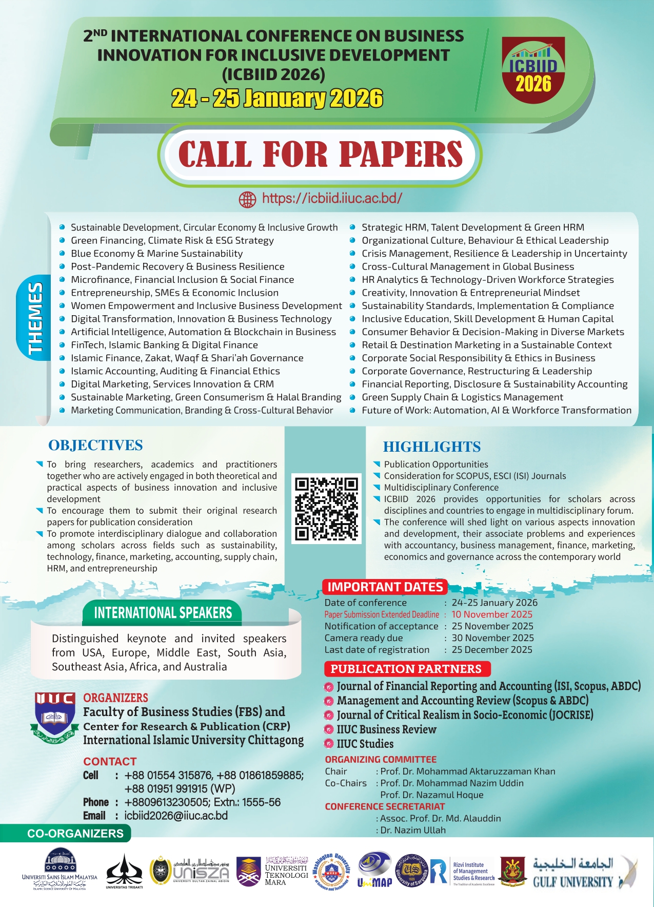 The International Conference on Business Innovation for Inclusive Development (ICBIID 2026), organized by the Faculty of Business Studies (FBS) in association with the Center for Research and Publication (CRP) at the International Islamic University Chittagong (IIUC), aims to bring together academics, researchers, professionals, policymakers, and students from around the world. ICBIID 2026 promotes scholarly exchange across diverse business disciplines such as Management, Marketing, Accounting, Finance, Human Resource Management, Supply Chain, Entrepreneurship, Technology, Corporate Governance, and Islamic Finance. The key objectives are to encourage quality research, explore emerging global trends, strengthen interdisciplinary collaboration, and empower early-career scholars. With a strong emphasis on innovation and inclusivity, the conference aspires to generate impactful insights and foster sustainable solutions for future-ready businesses.