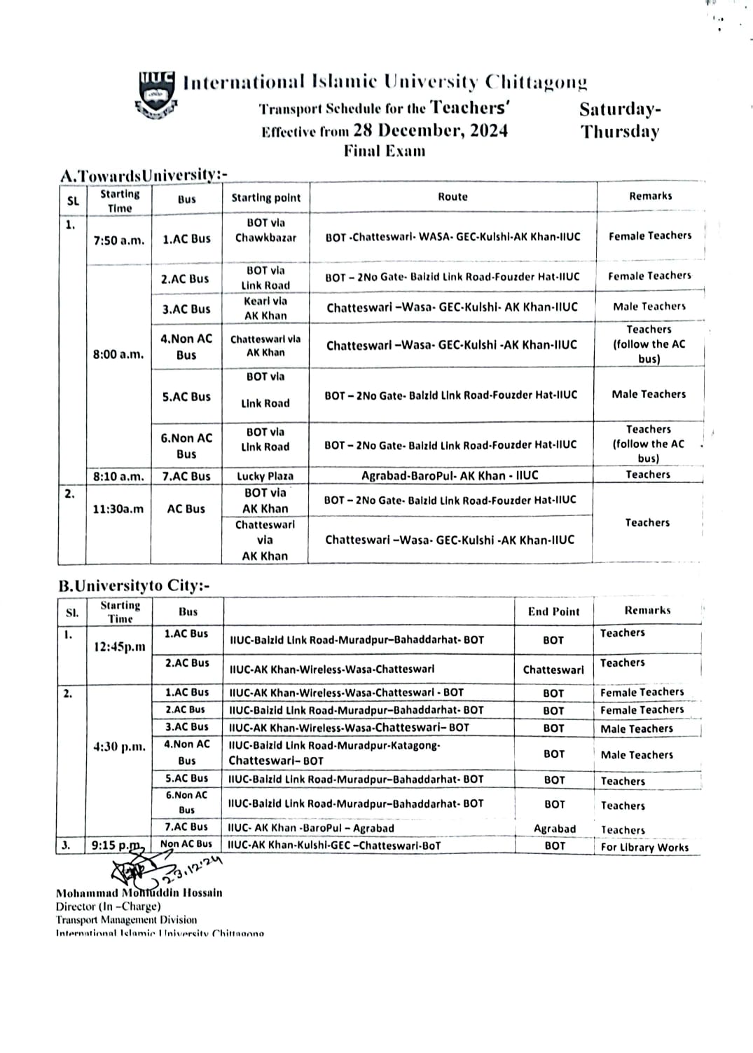 Transport Schedule for Officers and Staff effective from 28th December, 2024